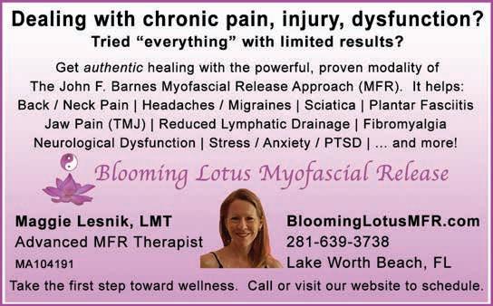 Begin your journey to authentic healing. Schedule today at BloomingLotusMFR.com or call 281-639-3738. See ad page 11.
