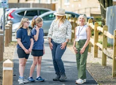 school's pupils with County Council Cabinet Member for Highways and Transport Joy Dennis and Headteacher Tracey Newbold. A new footway link and safe crossing points have been provided in Munthum Drive, Chapel Road and Two Mile Ash Road. The estimated cost was in excess of £100,000