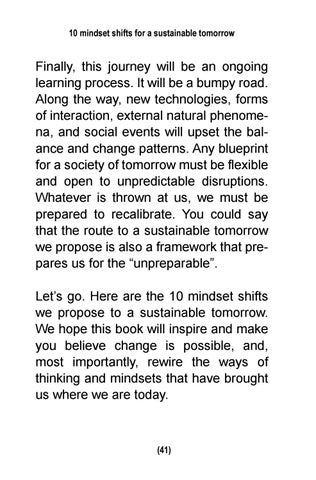 Finally, this journey will be an ongoing learning process. It will be a bumpy road. Along the way, new technologies, forms of interaction, external natural phenomena, and social events will upset the balance and change patterns. Any blueprint for a society of tomorrow must be flexible and open to unpredictable disruptions. Whatever is thrown at us, we must be prepared to recalibrate. You could say that the route to a sustainable tomorrow we propose is also a framework that prepares us for the “unpreparable�. Let’s go. Here are the 10 mindset shifts we propose to a sustainable tomorrow. We hope this book will inspire and make you believe change is possible, and, most importantly, rewire the ways of thinking and mindsets that have brought us where we are today.