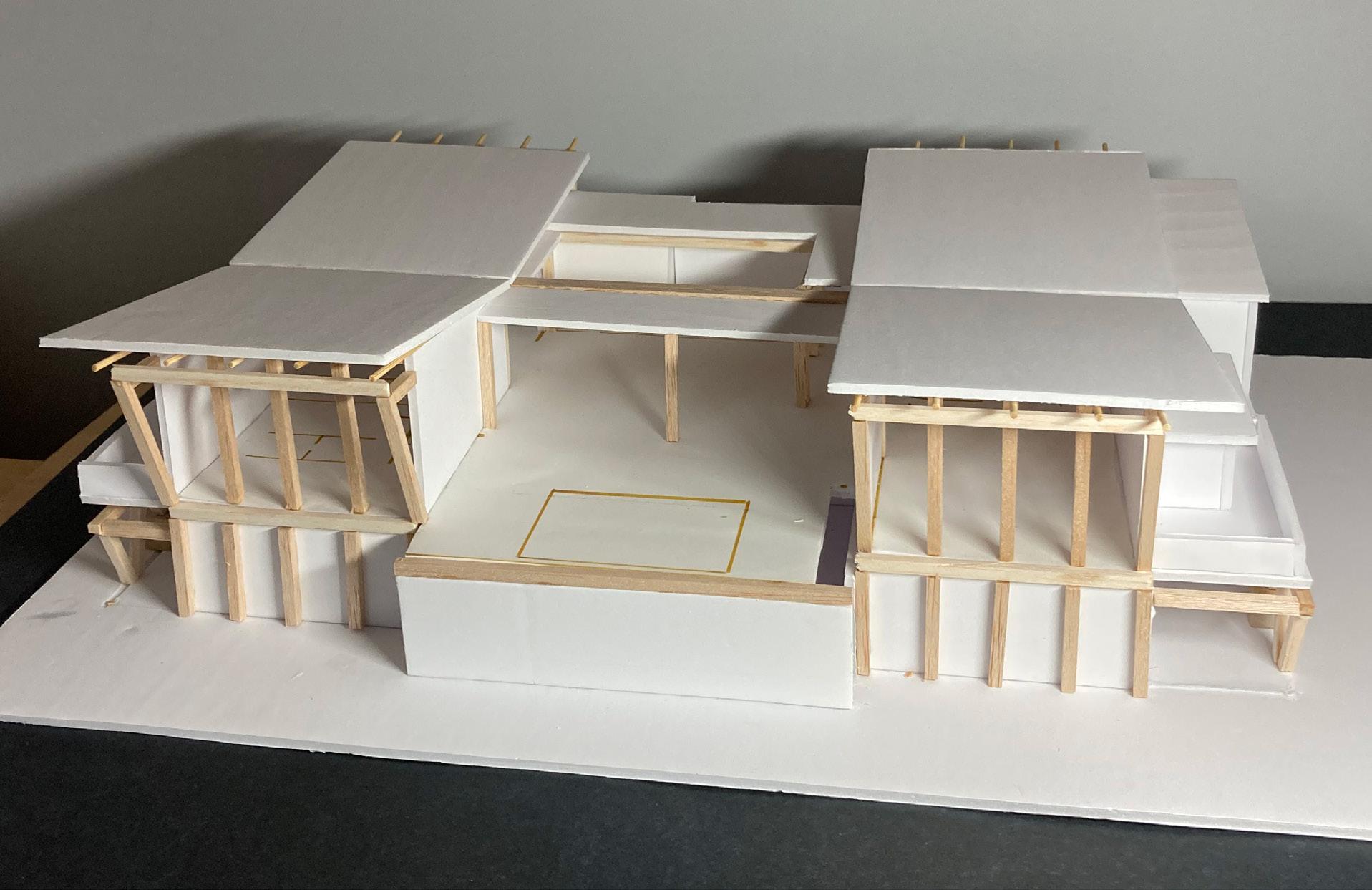 STRUCTURE: Stepped foundations Timber frame with exposed steel connections; Butterfly roof.