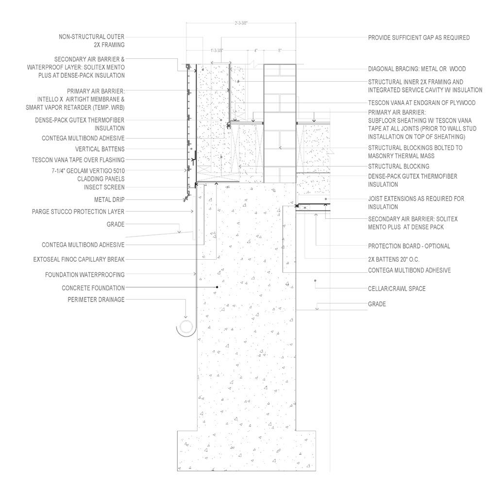 PASSIVHAUSE certified building envelope by 475 Smart Enclosure system, with advanced high performance Double-Stud Assembly, Concrete foundation footings with crawl space and unvented roof.