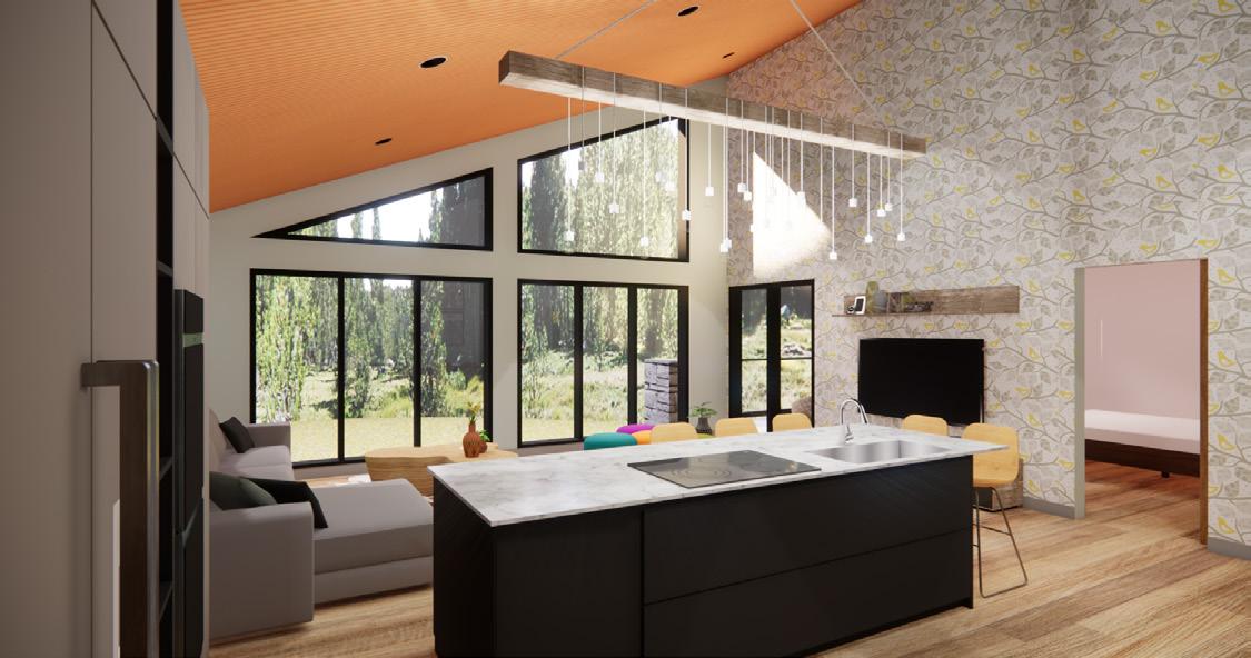 Exposed glu-lam structural columns on truss girders. SIP panels. High-efficiency glazing to help mitigate solar heat gain.