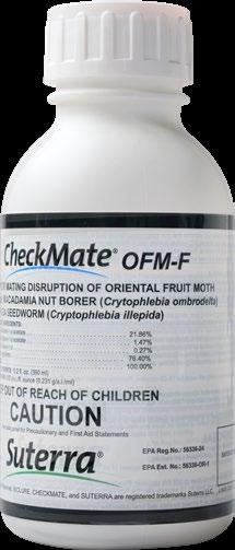 This proprietary formulation results in enhanced aerosolization of the pheromone creating a spray that better penetrates targeted areas of the canopy. The fastto-deploy product releases a precise, consistent amount of CM sex pheromone throughout the orchard, reducing adult males’ ability to find females. This disrupts the mating cycle and suppresses pest populations.