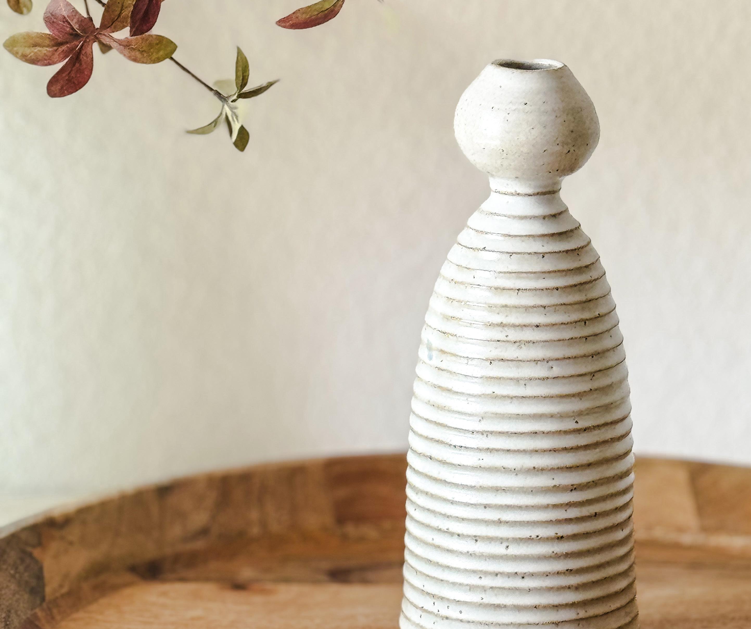 “Tooled” vase with cream glaze adding a striking visual element to your favorite space. 10”h x 3.25”w.