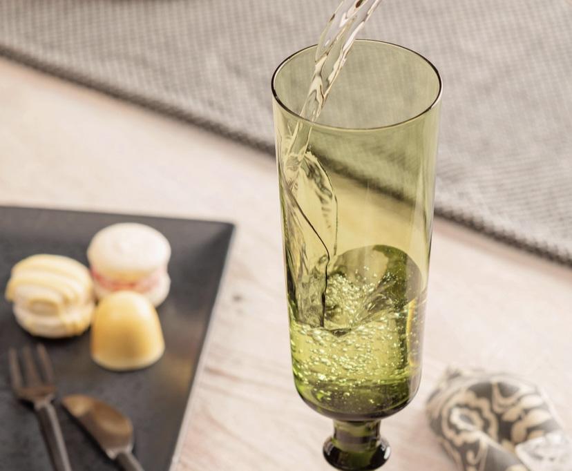Vintage urban design meets functionality in these champagne flutes. Perfect way to add a pop of color to any table settings.