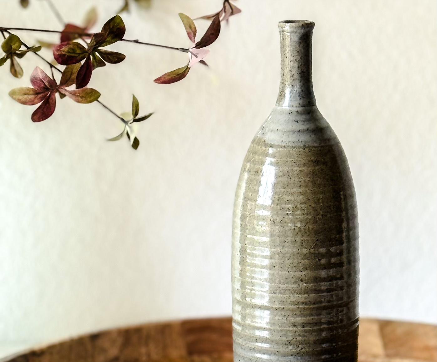 Textured vase with sage green glaze. Size measures at 13”h x 4” w.