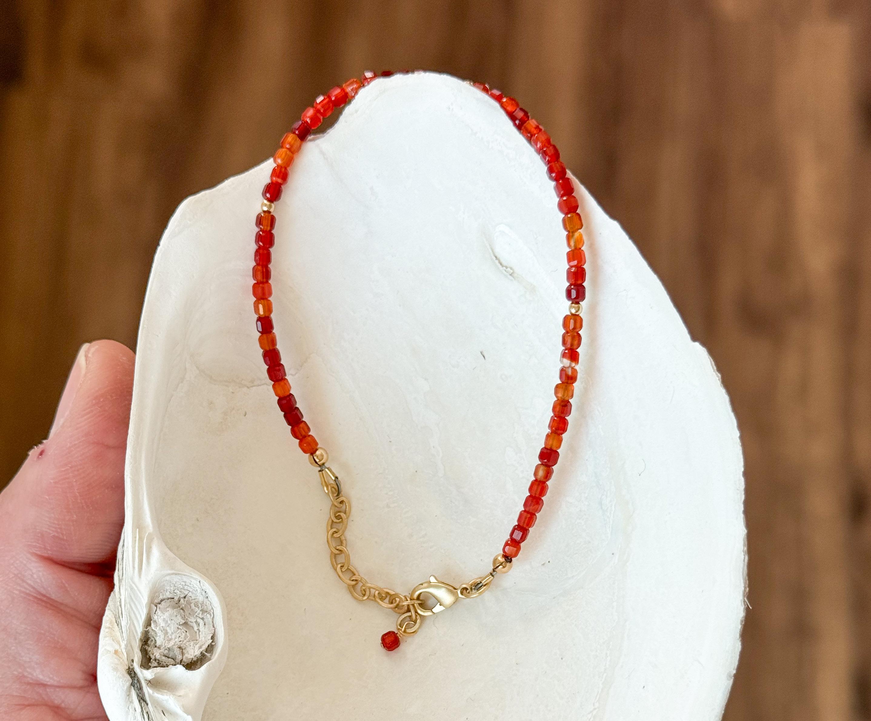 14K yellow gold chain and clasp closure, featuring a single garnet stone.