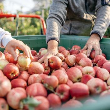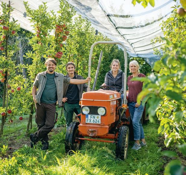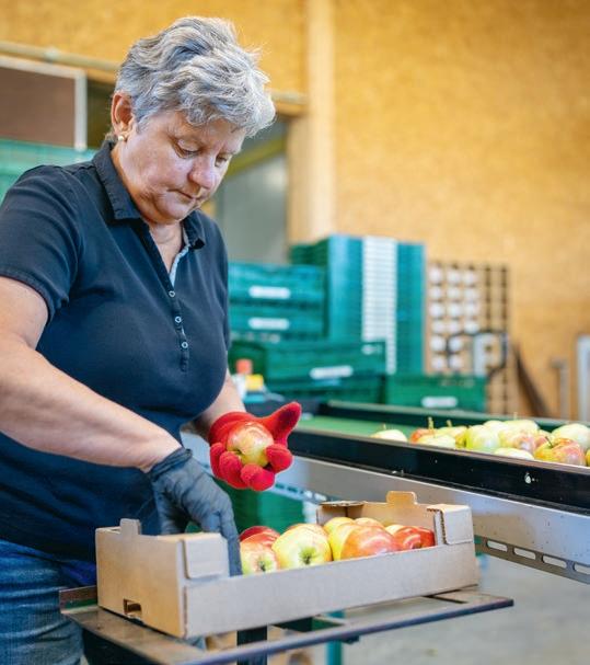 aus dem Lager und von dort direkt in die Waschanlage. Hier werden sie gereinigt und sanft auf Hochglanz gebürstet. Anschließend werden die Äpfel nach ihrer Größe sortiert. In Sutterlüty’s Bio-Apfelkisten allerdings kommen nur die schönsten. Dafür sorgt Mia mit prüfendem Blick auf jede einzelne Frucht. Bei großen Bestellungen gehen ihr Senior*innen aus dem Ort zur Hand. Auch Johannes’ Papa Peter und Mama Monika Bentele sind nach wie vor immer zur Stelle, wenn ihre Hilfe gebraucht wird.