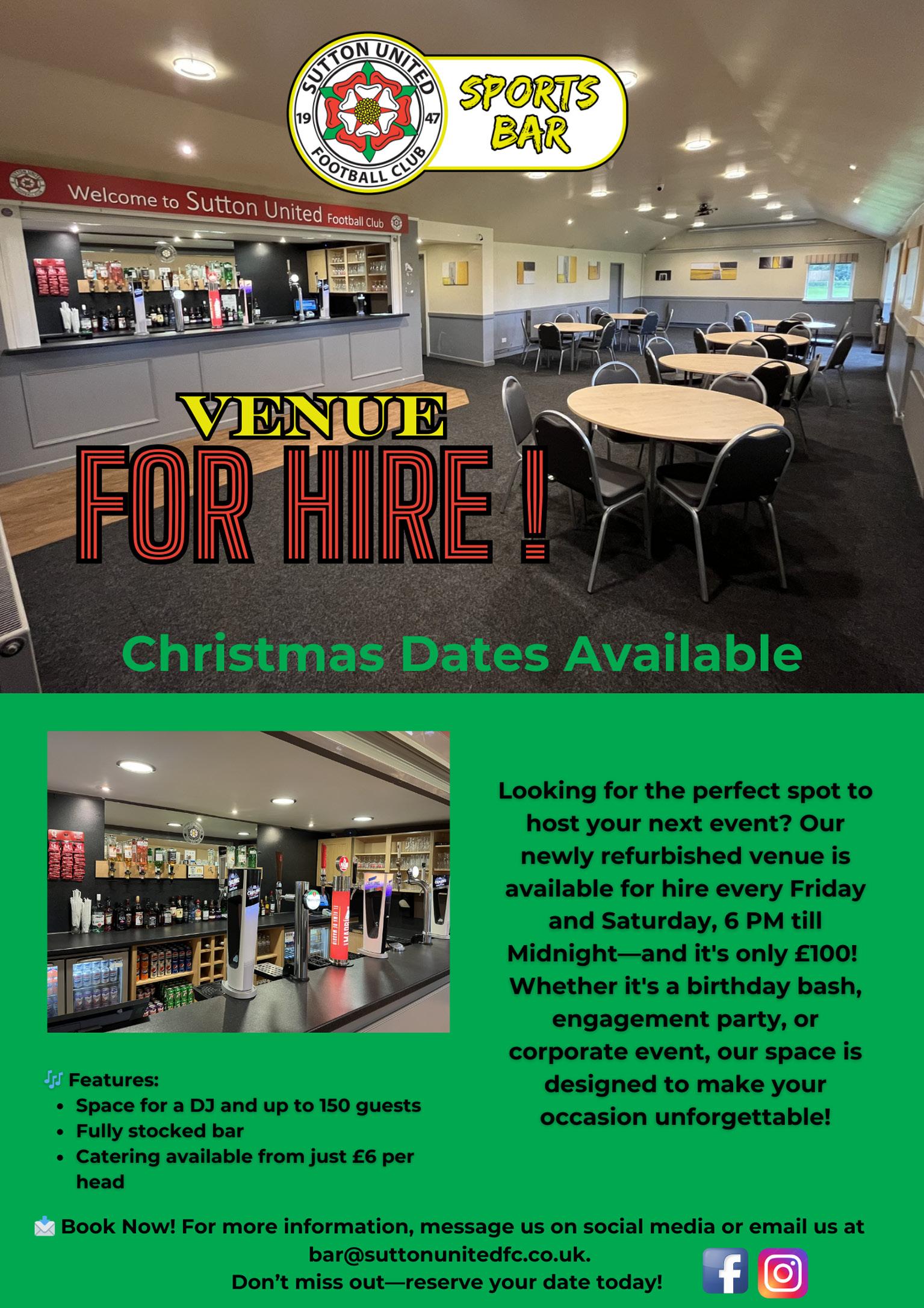 For queries on our live music and entertainment, please email at: bar@suttonunitedfc.co.uk