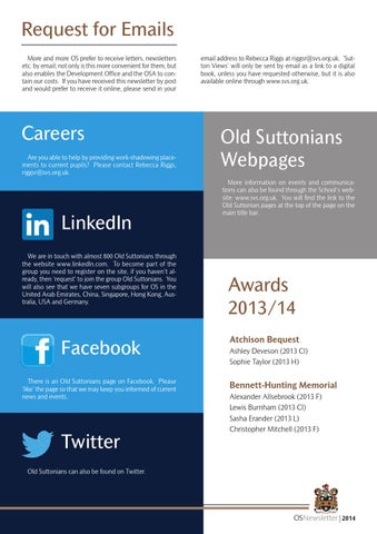 Request for Emails More and more OS prefer to receive letters, newsletters etc. by email; not only is this more convenient for them, but also enables the Development Office and the OSA to contain our costs. If you have received this newsletter by post and would prefer to receive it online, please send in your