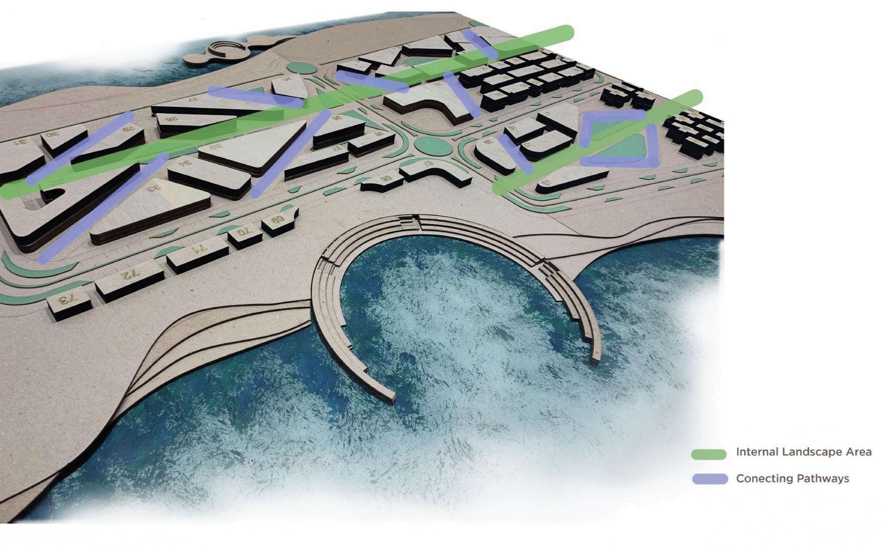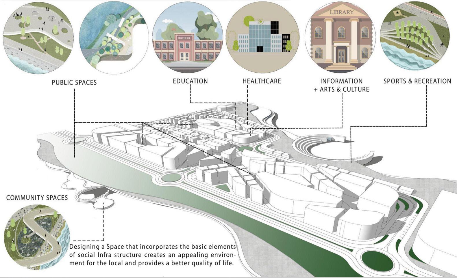 Includes public, private and mix use spaces integrated along with landscape to create harmony with nature