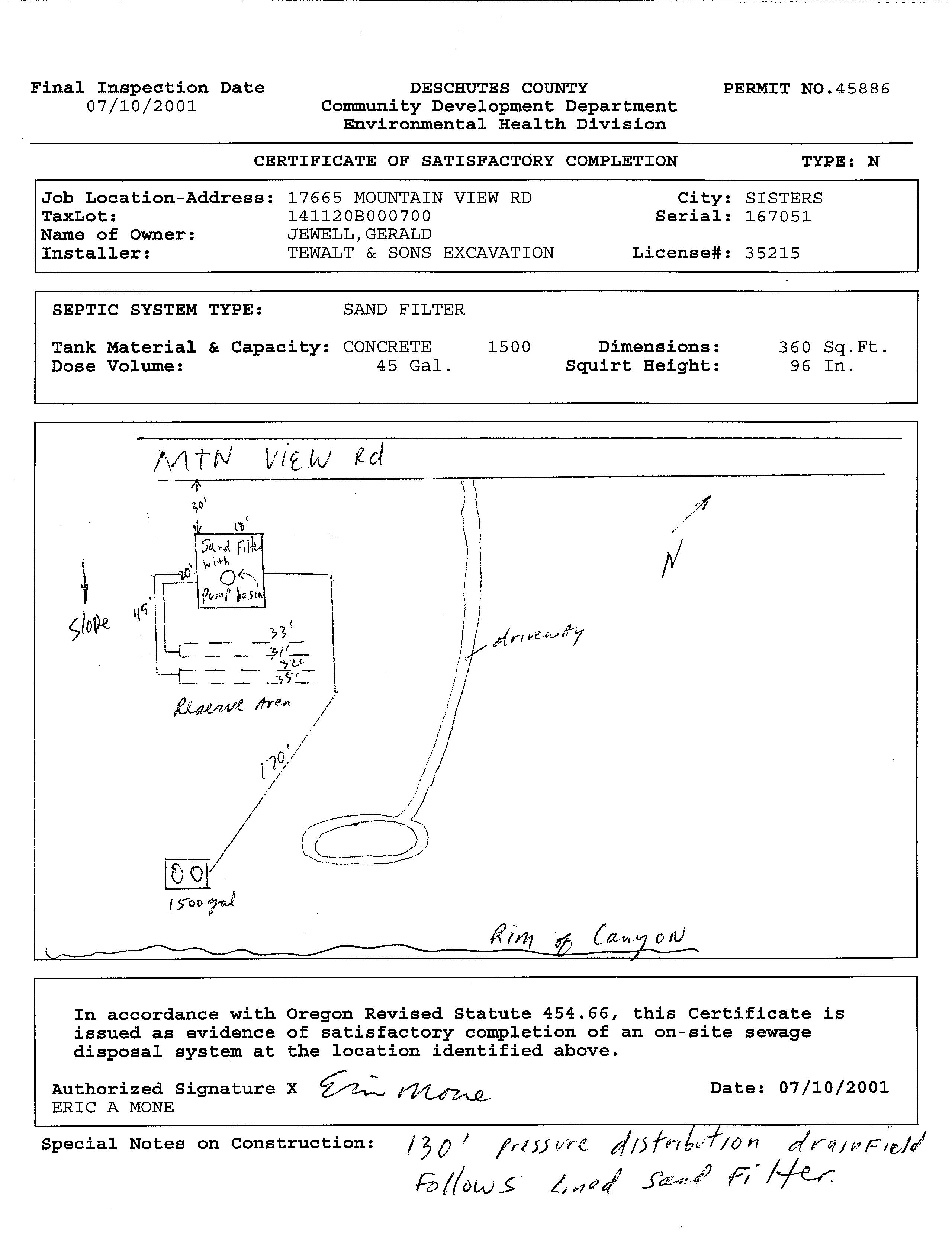 Final Inspection Date 07/ 10/ 2001 DESCHUTES COUNTY Community Development Department Environmental Health Division PERMIT NO. 45886 CERTIFICATE OF SATISFACTORY COMPLETION TYPE: N Job Location - Address: TaxLot: Name of Owner: Installer: 17665 MOUNTAIN VIEW RD 141120B000700 JEWELL, GERALD TEWALT & SONS EXCAVATION City: SISTERS Serial: 167051 License#: 35215 SEPTIC SYSTEM TYPE: SAND FILTER Tank Material & Capacity: CONCRETE Dose Volume: 45 Gal. 1500 Dimensions: Squirt Height: 360 Sq. Ft. 96 In. OPe V' E d 170 Oo 1500& i fv-Iof. u,Jr In accordance with issued as evidence disposal system at Oregon Revised Statute 454. 66, this Certificate is of satisfactory completion of an on- site sewage the location identified above. Authorized Signature X ERIC A MONE Date: 07/ 10/ 2001 Special Notes on Construction: 30 / frt5J( A"- dI57e-/t,./ 0n lbws 444 J- /'