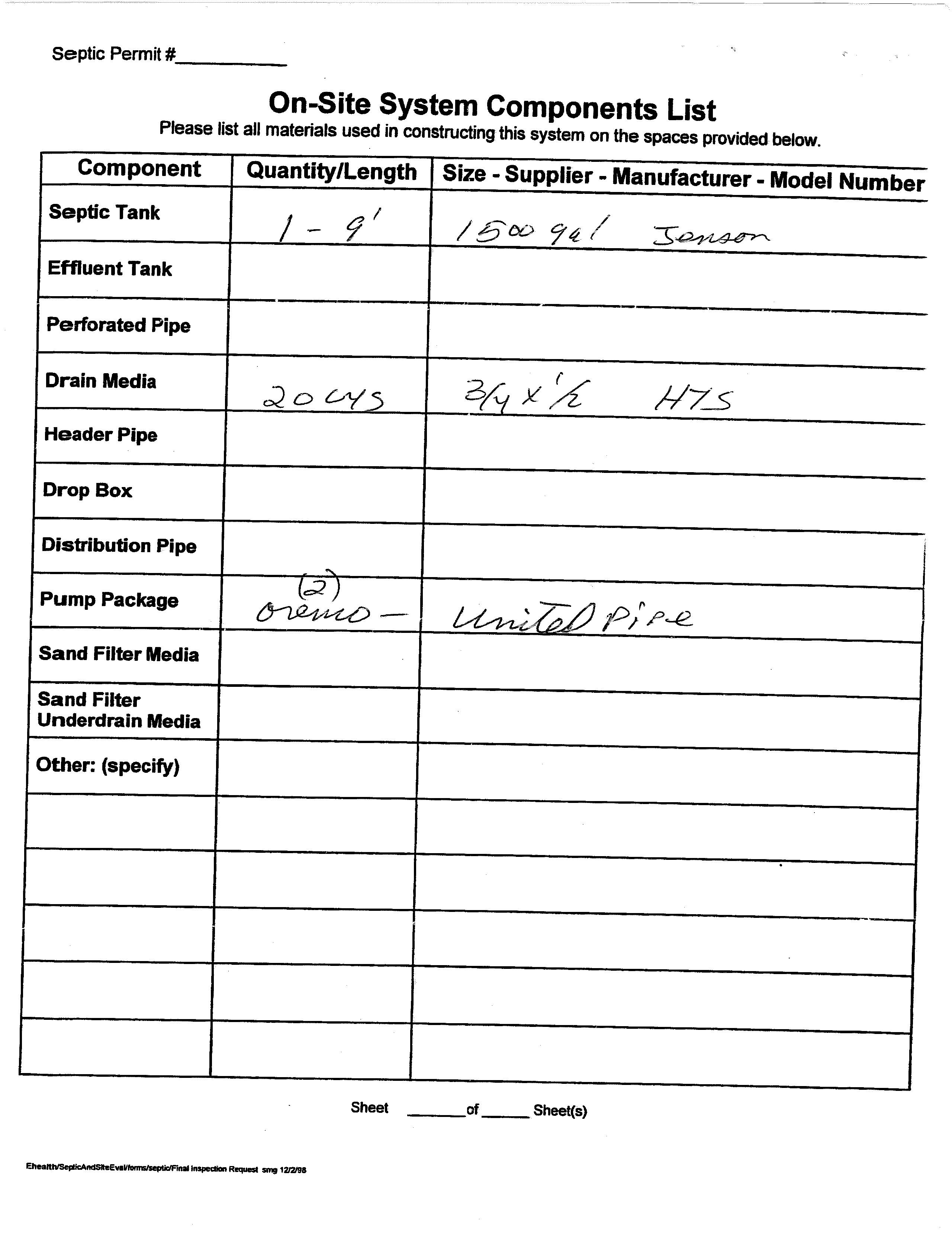 Component Quantity/ Length Septic Tank Effluent Tank Size - Supplier - Manufacturer - Model Number 4 e Perforated Pipe Drain Media Header Pipe 17 ;_ Drop Box Distribution Pipe Pump Package