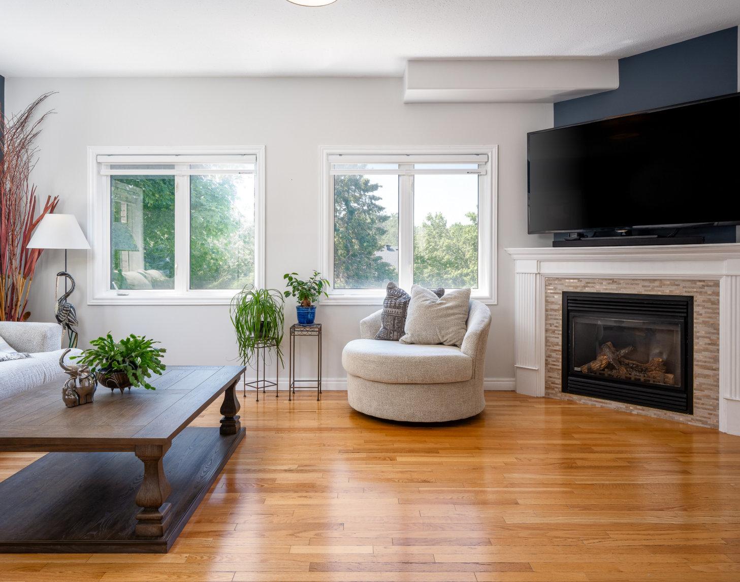 Large windows and a natural gas fireplace create a warm and inviting atmosphere in the main floor living room. Timeless hardwood flooring complements any furniture style, adding both elegance and versatility to the space.