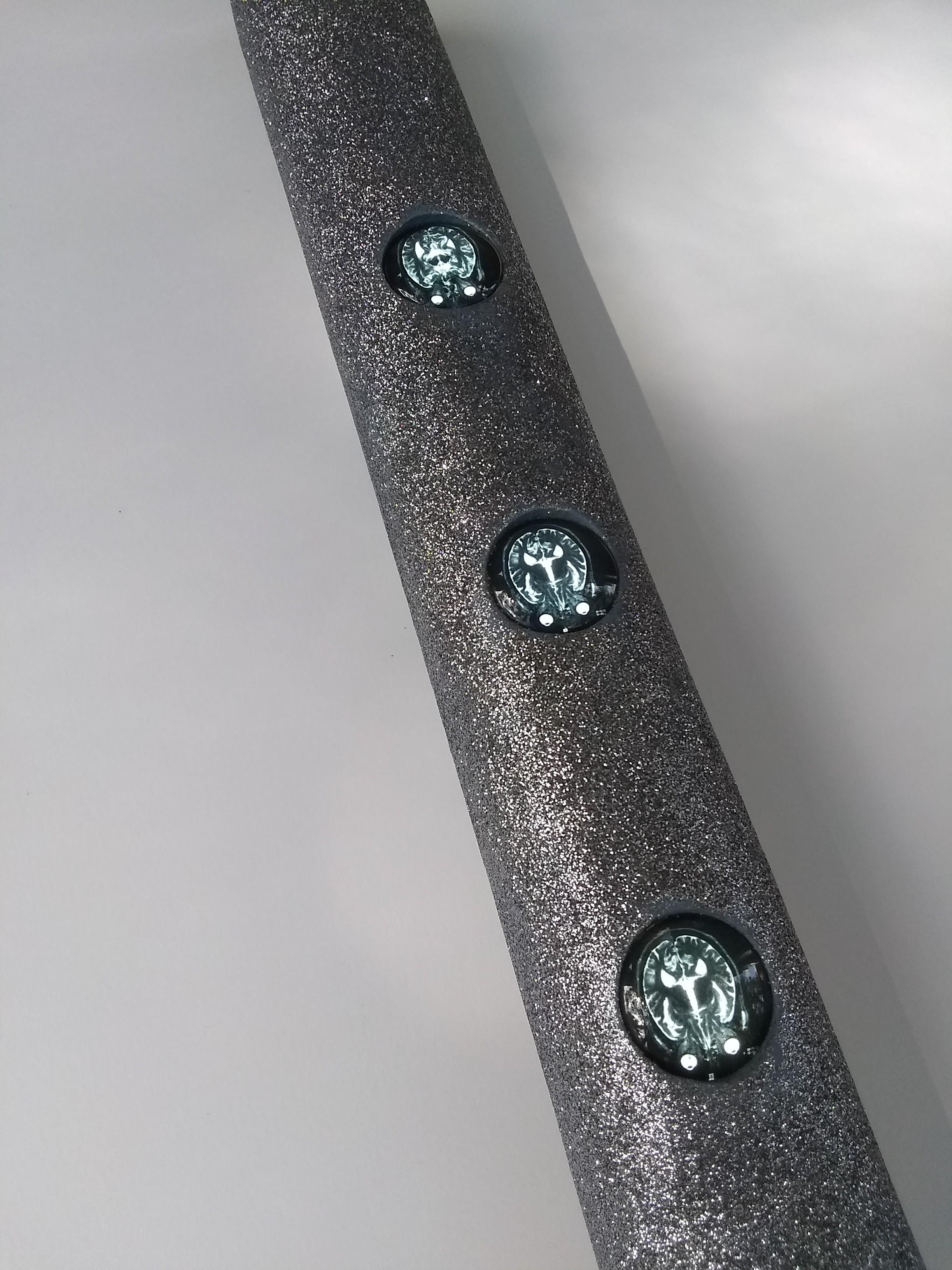 Wood, adhesive, slide film, glass, acrylic, metal jump ring, cotton string, acrylic paint, glitter, light stick with rechargeable battery. 2” x 2 ¼ ” x 16 ¾ ”