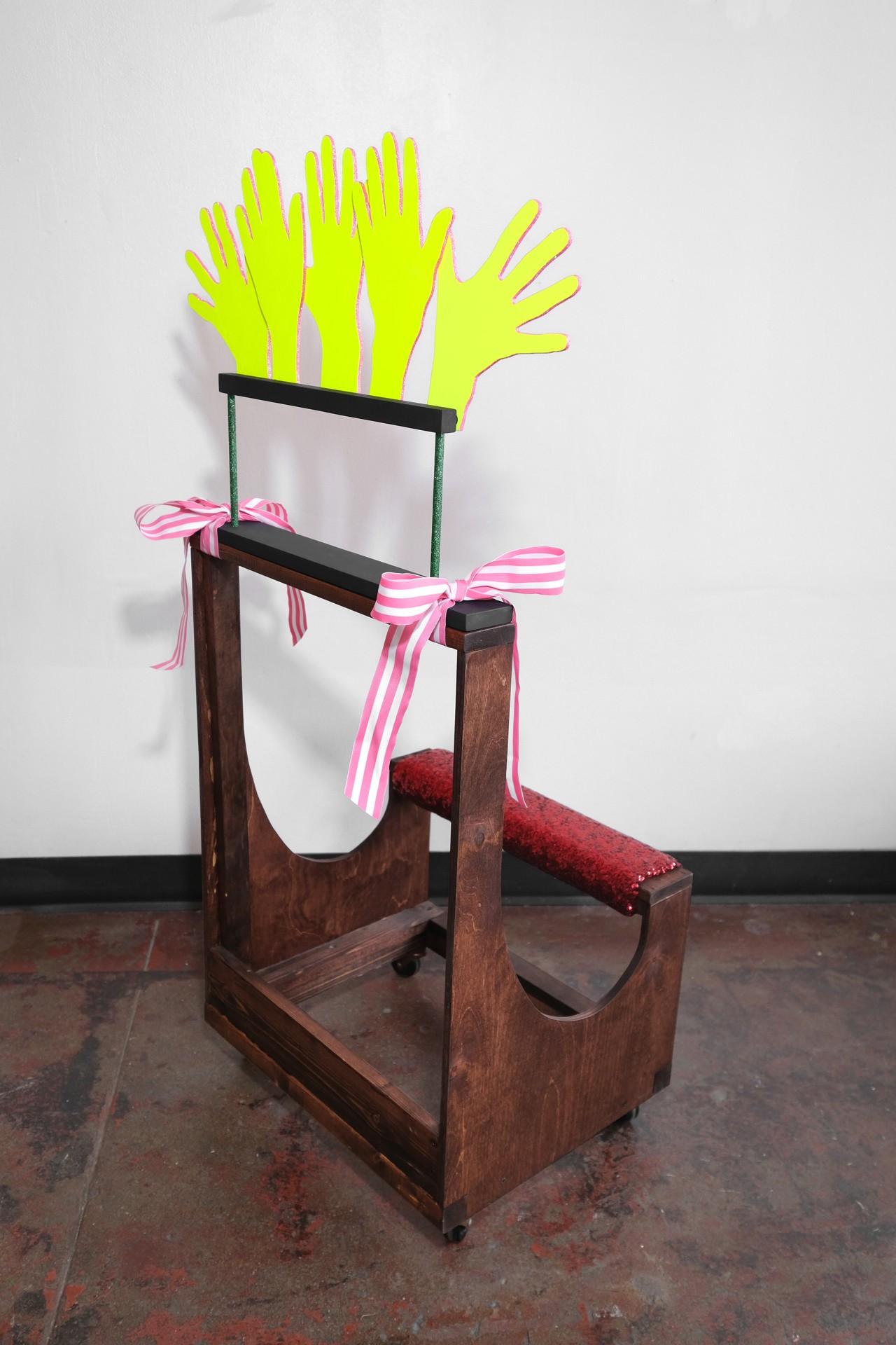 Wood, fabric, acrylic paint, metal, glitter, adhesive and plastic casters.