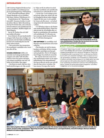 INTEGRATION » GRÖNA NÄRINGAR LRF. Gudrun Haglund Eriksson har också anställt en nyanländ person på sin gård Bengtstorp i Närkesberg. Från Arbetsförmedlingen deltar Evgeni Rudenko och en politiker från länet, Helena Vilhelmsson (C). Projektledaren för ”Matchning mot jobb”, Susanna Jordán, är med på mötet, liksom Björn Brunnberg, chef på SV Örebro län, och verksamhetsutvecklarna och praktiksamordnarna i projektet, Shalhla Ojagh och Ihab Shagora. Det är SV Örebro län och LRF som kallat till mötet. Sven Dybeck vill som lantbruksföretagare lyfta fram det orimliga i att en person som har både anställning, bostad och avtalsenlig lön inte får börja arbeta direkt. – Det motverkar den integration för nyanlända i samhället som i stort sett alla vill ha. SUSANNA JORDÁN HAR träffat och samtalat med många lantbruksföretagare som söker folk till olika arbeten inom den gröna näringen och många nyanlända som inte vill hellre än att jobba. Hon säger: – Det finns en stark vilja hos våra lantbruksföretagare att vilja anstäl-