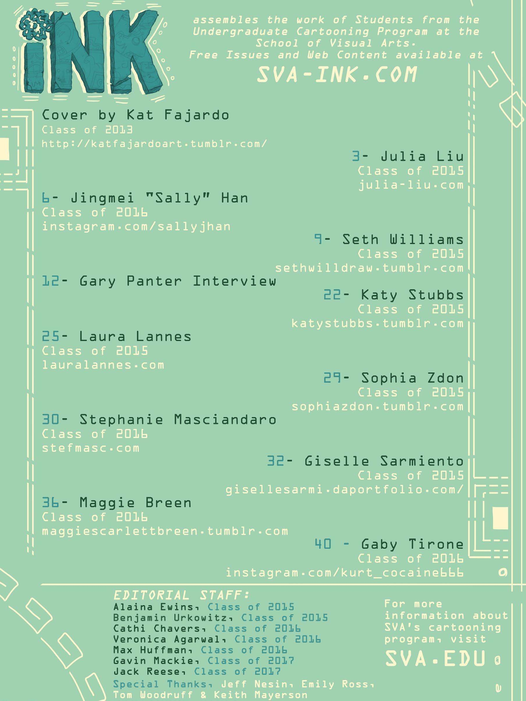 INK magazine assembles the best comics by students at the School of Visual Arts in New York City. Read more at inksva.com . All stories © 2015 by their respective authors. All rights reserved. No work from this magazine may be excerpted or reprinted without permission from the author.