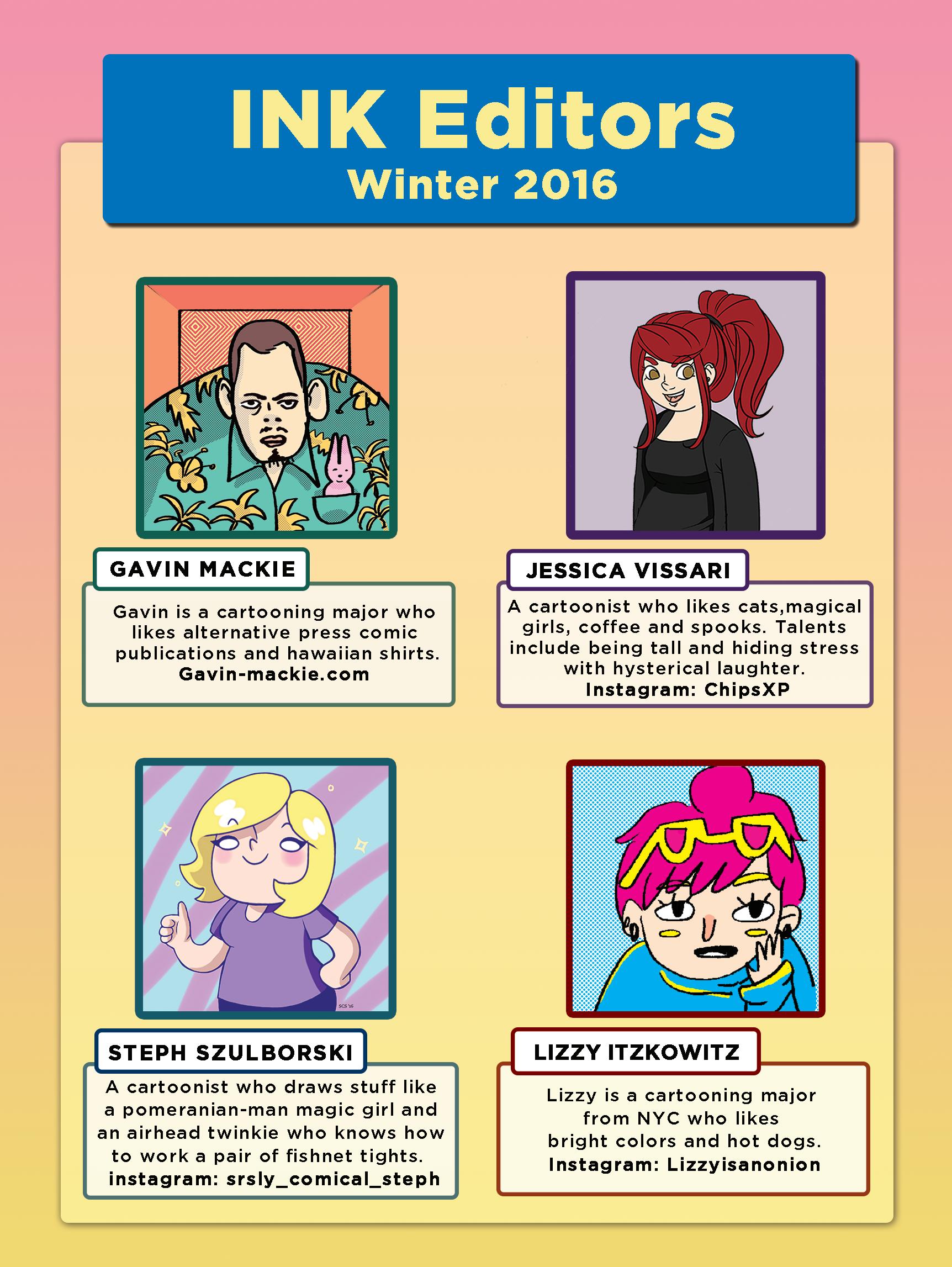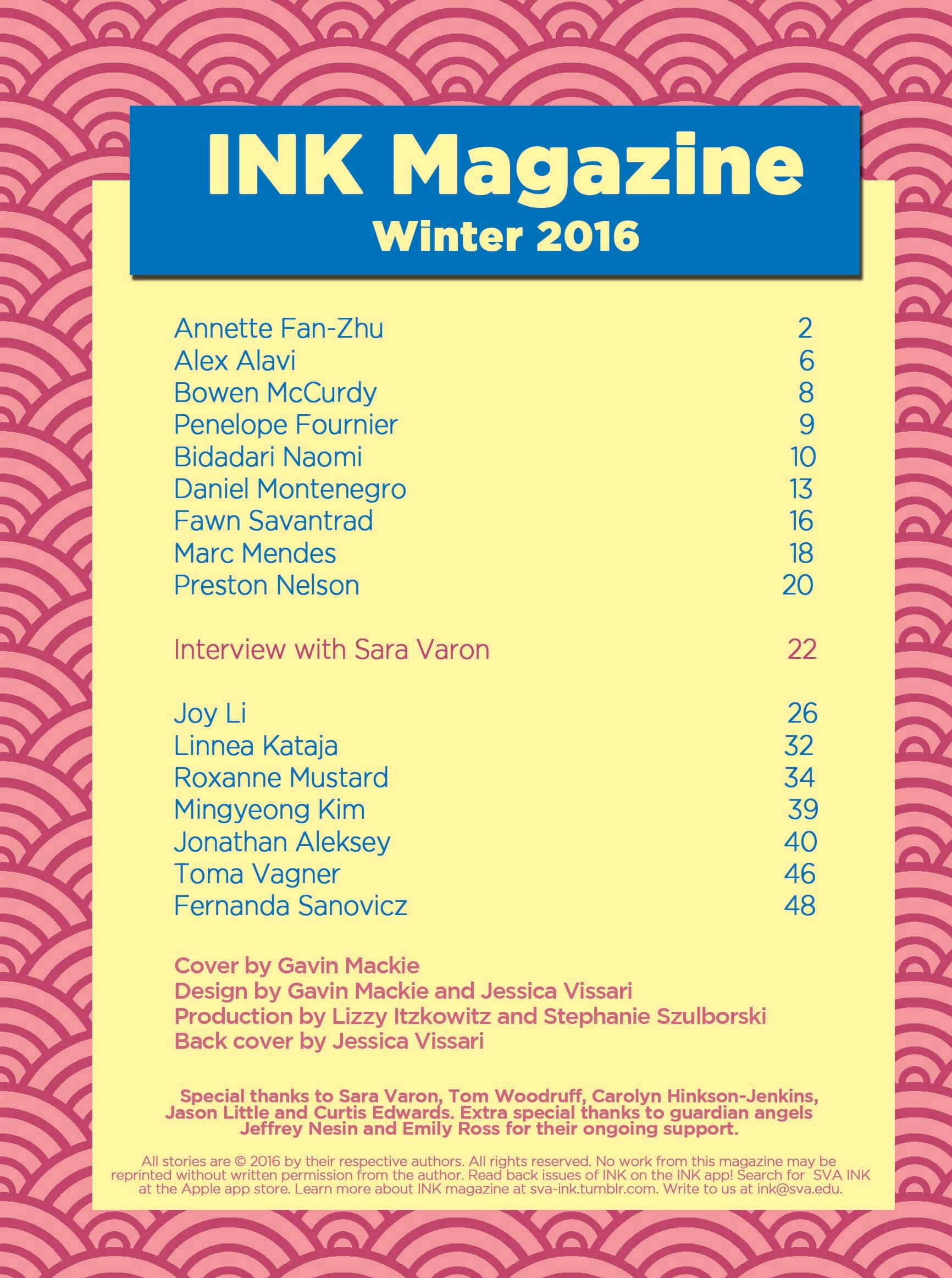 INK magazine assembles the best comics by students at the School of Visual Arts in New York City. Read more at inksva.com . All stories © 2016 by their respective authors. All rights reserved. No work from this magazine may be excerpted or reprinted without permission from the author.