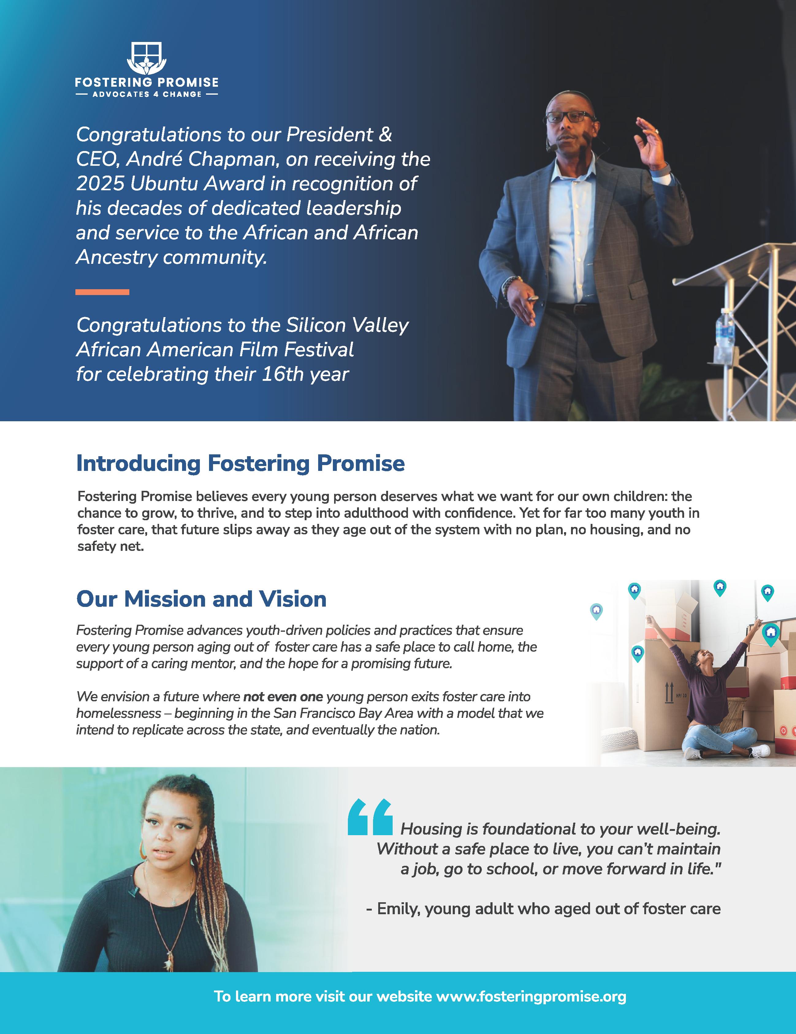 Today, André leads his most audacious endeavor as Founder and CEO of Fostering Promise Advocates-4-Change, working at the intersection of housing, child welfare and technology to ensure that Not Even One young person ages out of foster care into homelessness.