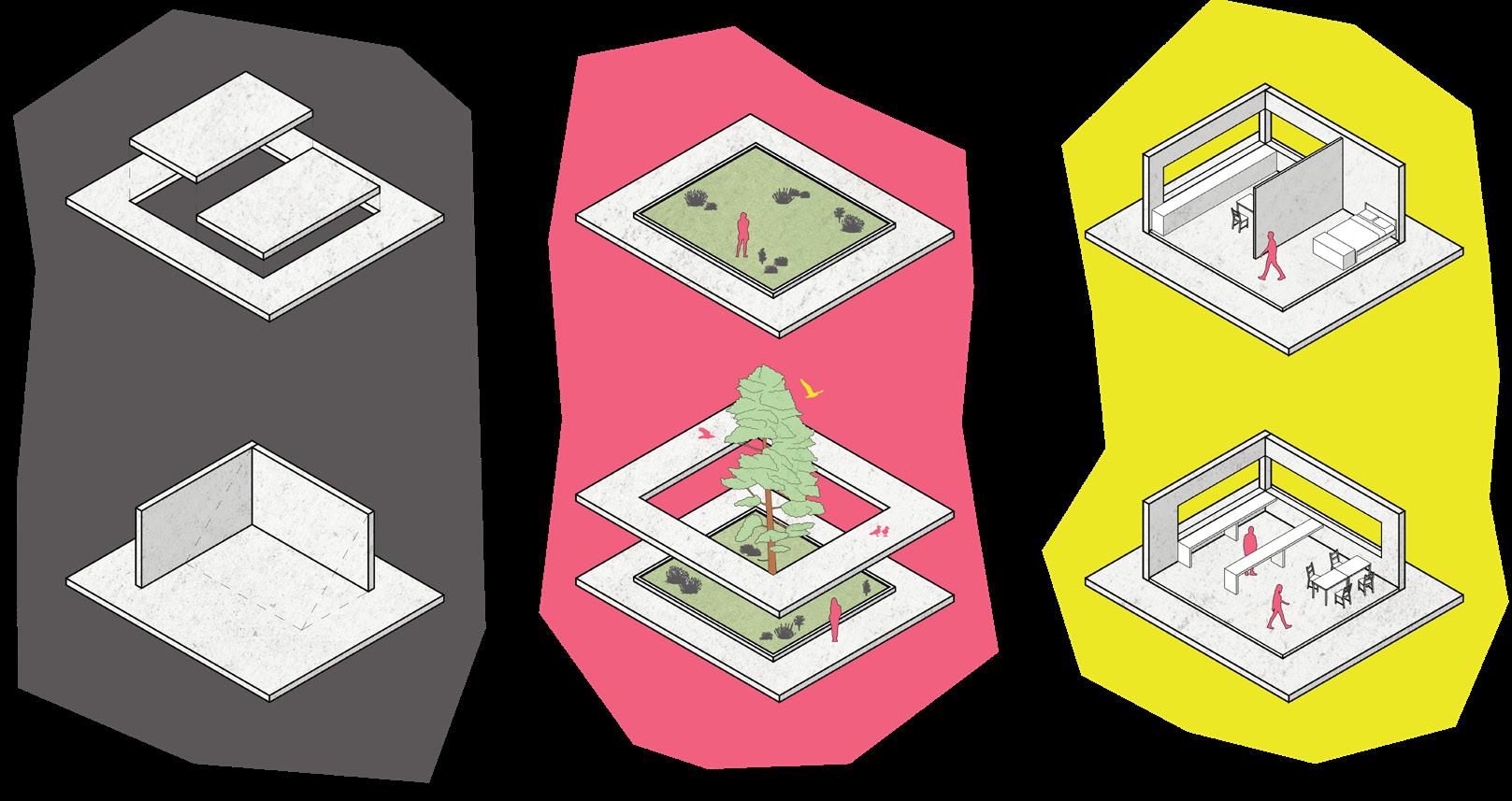 Drawings split into three categories (human dwelling, provisions, and wildlife habitat), the existing structure is reused, eroded, reinforced, etc. to be suitable for its newly extended lifespan