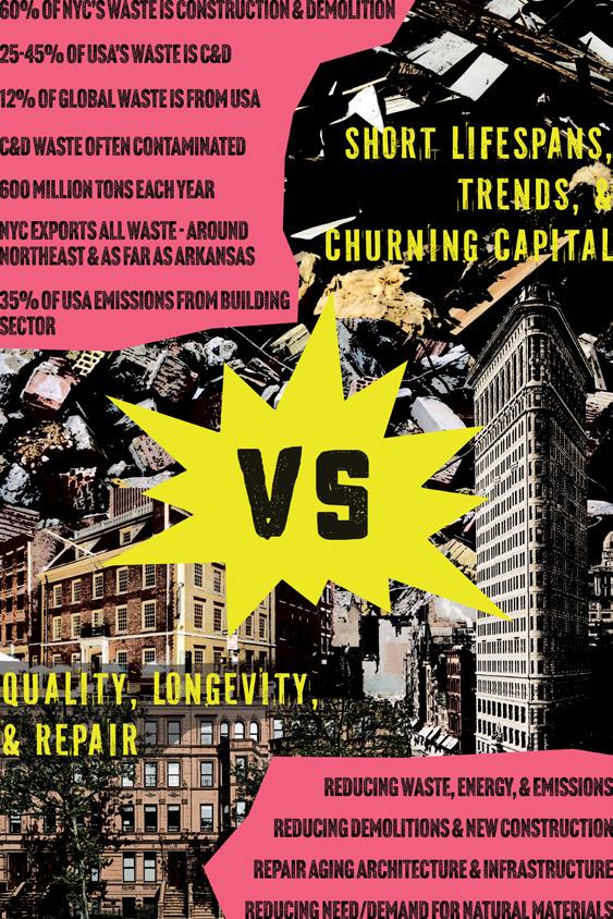argued for prioritizing the reimagining and reuse of existing buildings in response to the current climate crisis and coming resource depletions. It explored a possible future in which demolitions are restricted.