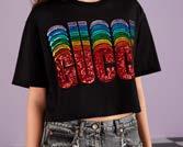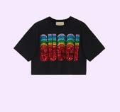 Los bordados se convierten en imágenes inesperadas con un toque brillante en la colección Cruise 2023 Cruise 2023 Gucci Cosmogonie. Esta camiseta corta de punto de algodón se realza con un logotipo Gucci de lentejuelas multicolor.
