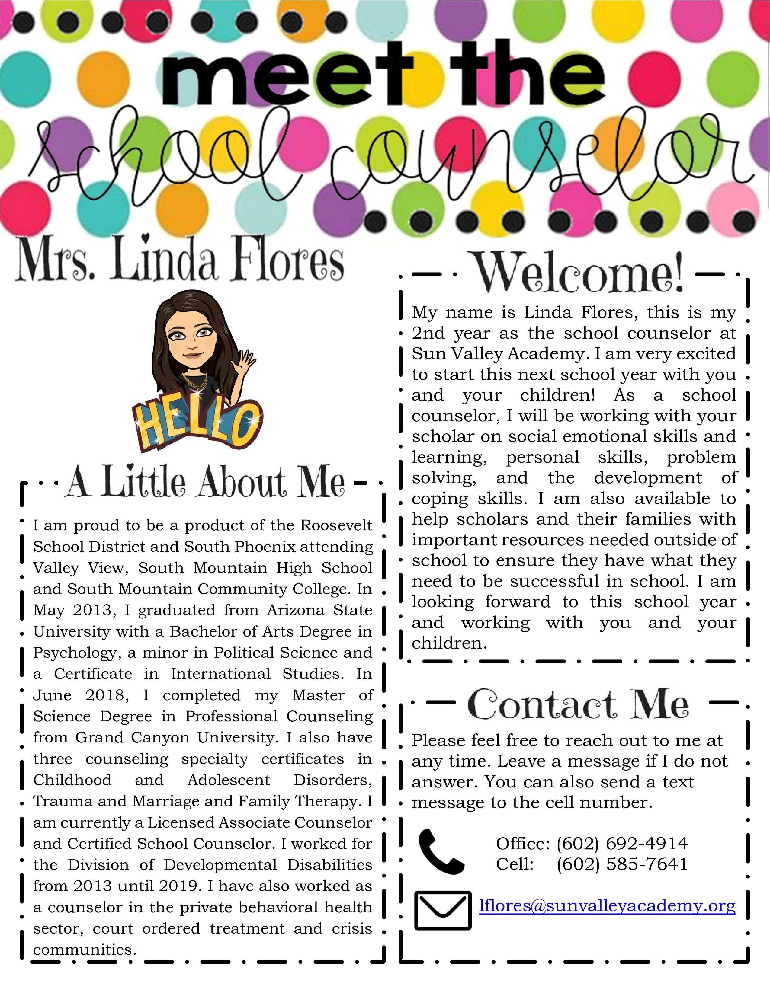 Parents and guardians are encouraged to contact Mrs. Flores with questions or concerns regarding issues that may be affecting your child’s academic progress. Such topics could include family changes, social difficulties, or mental health problems. Opening the door of communication to your child's challenges is beneficial to the services that the School Counselor can provide to your child during the school day. Mrs. Flores can be reached via ClassDojo, cell phone (602)585-7641 or email, lflores@sunvalleyacademy.org