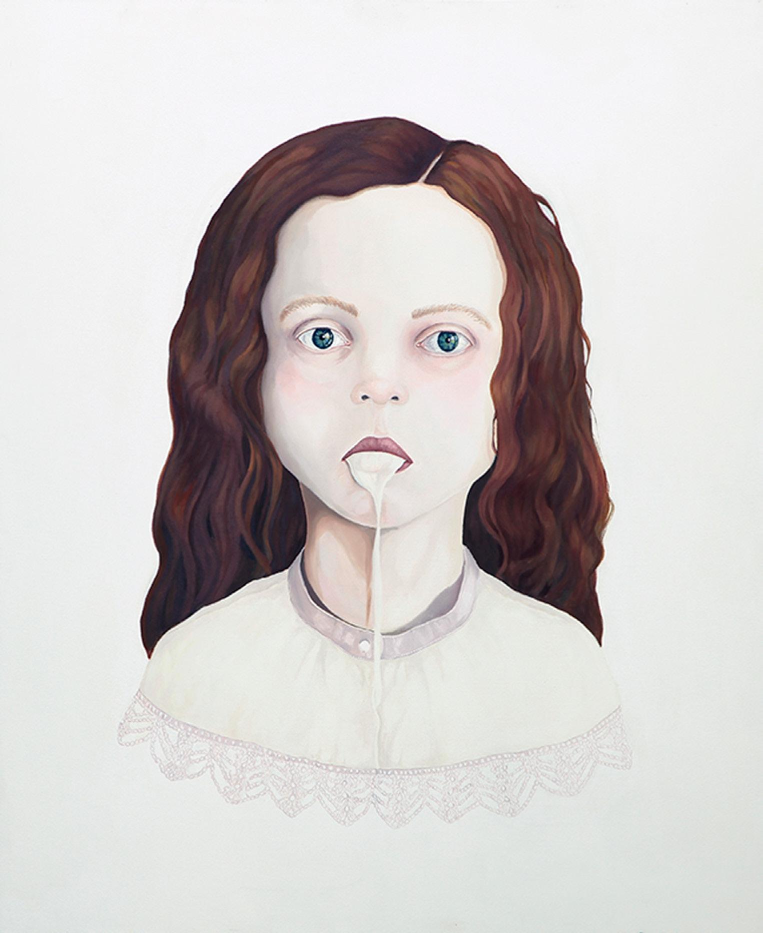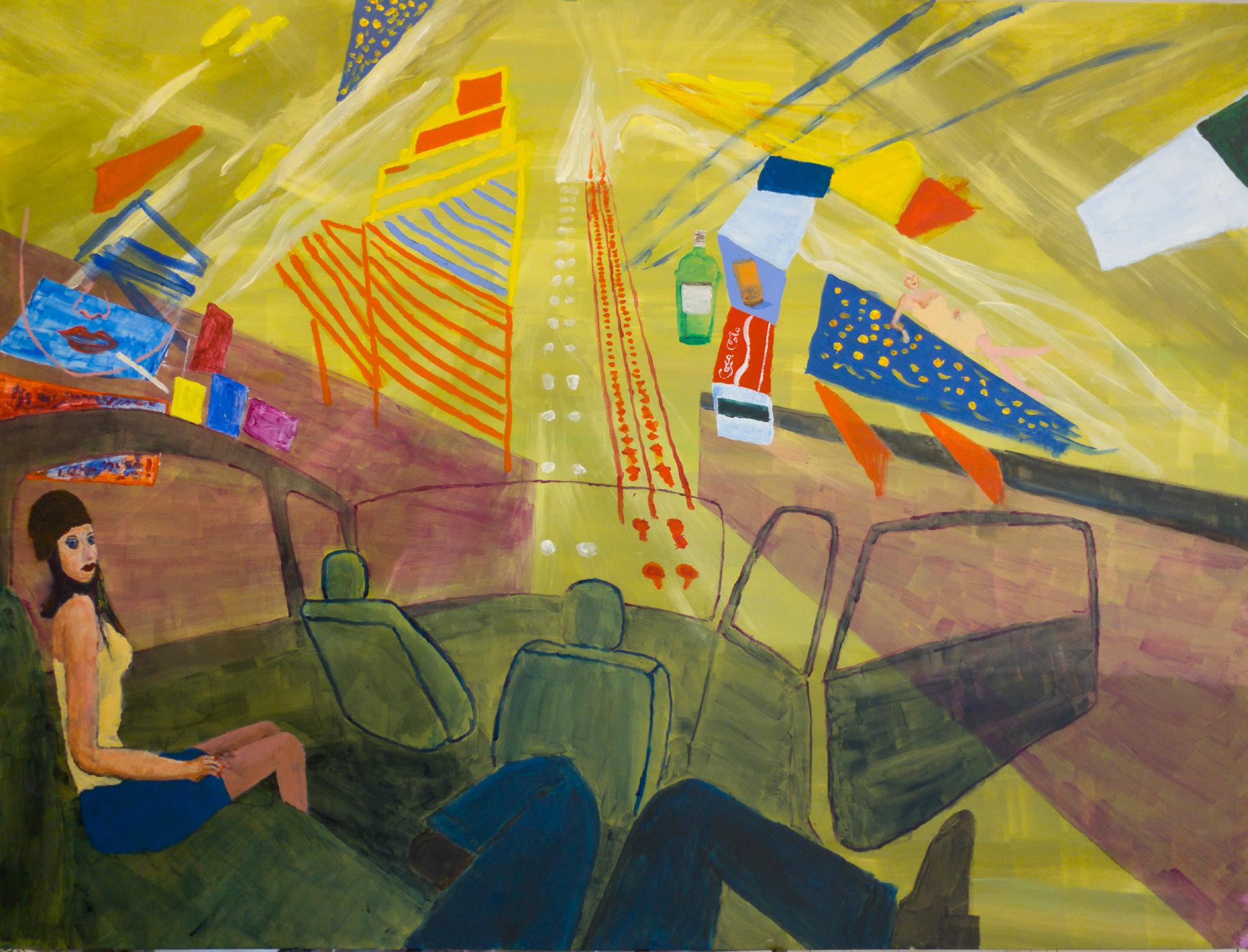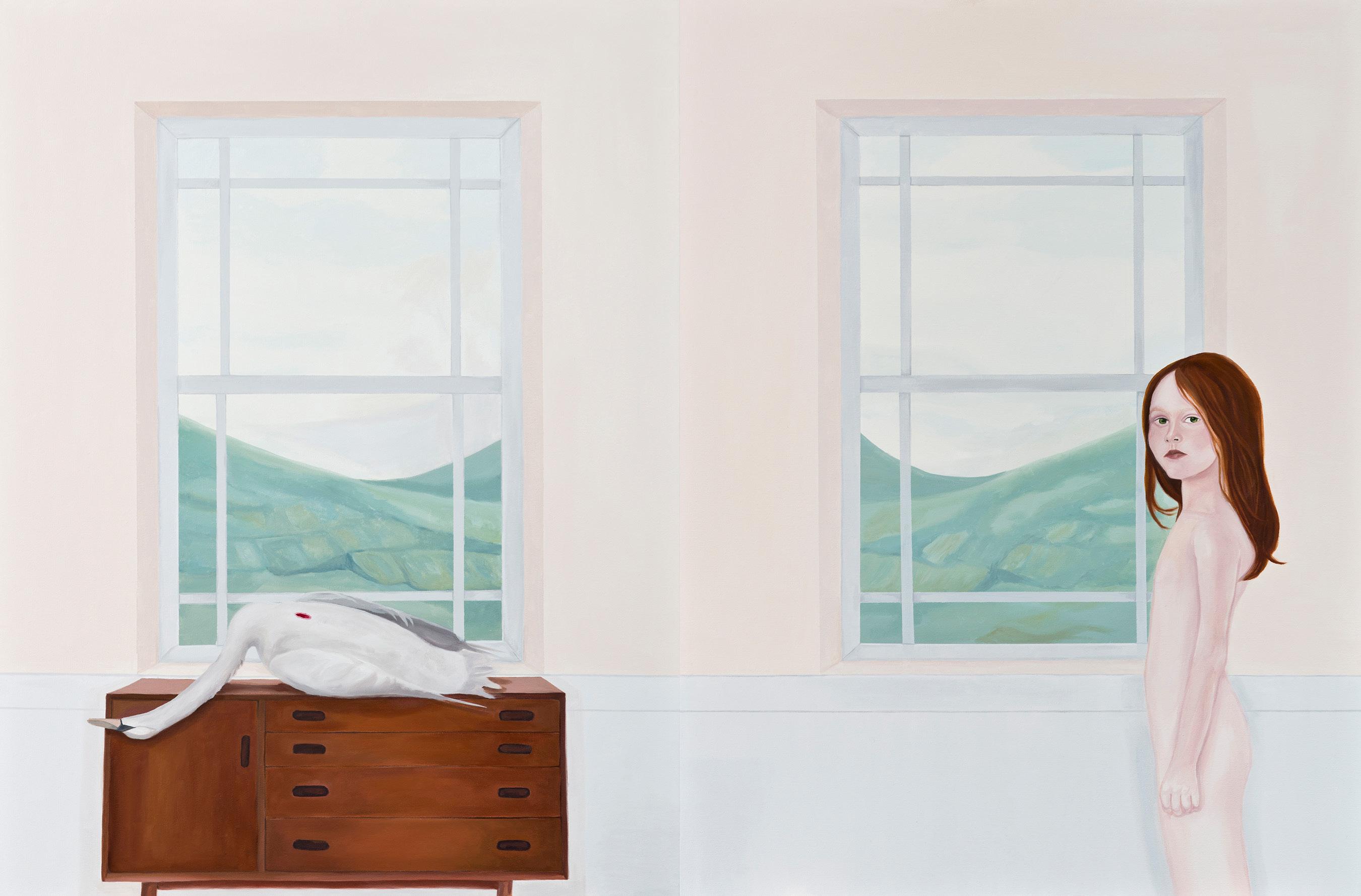 windows in Denizci’s paintings are borrowed from views outside her studio: sometimes the green hills of Istanbul, and sometimes the gentle waves of the Bosporus. She says that surroundings turn into ideas, but her motivation comes from within. As an artist she has an internal urge to create, more powerful than any inspiration from the outside world. She takes images and impressions from various times, media and places, and gathers them in an intentionally flat and unsettling shared space. Denizci is able to take a tranquil view of remote green mountains behind muted, rose-colored walls and, with calculated and meticulous ease, place in front a dead, bleeding swan and a pensive, naked adolescent girl.