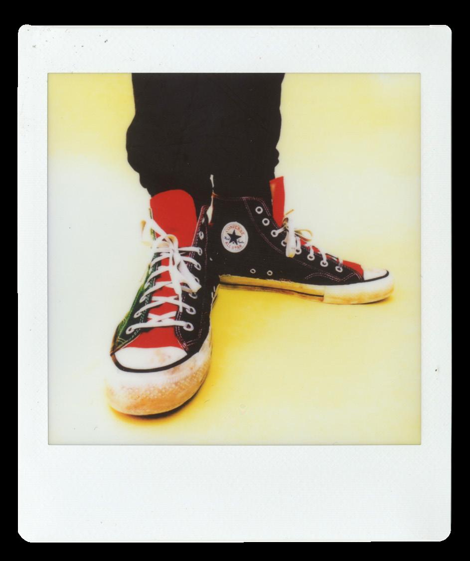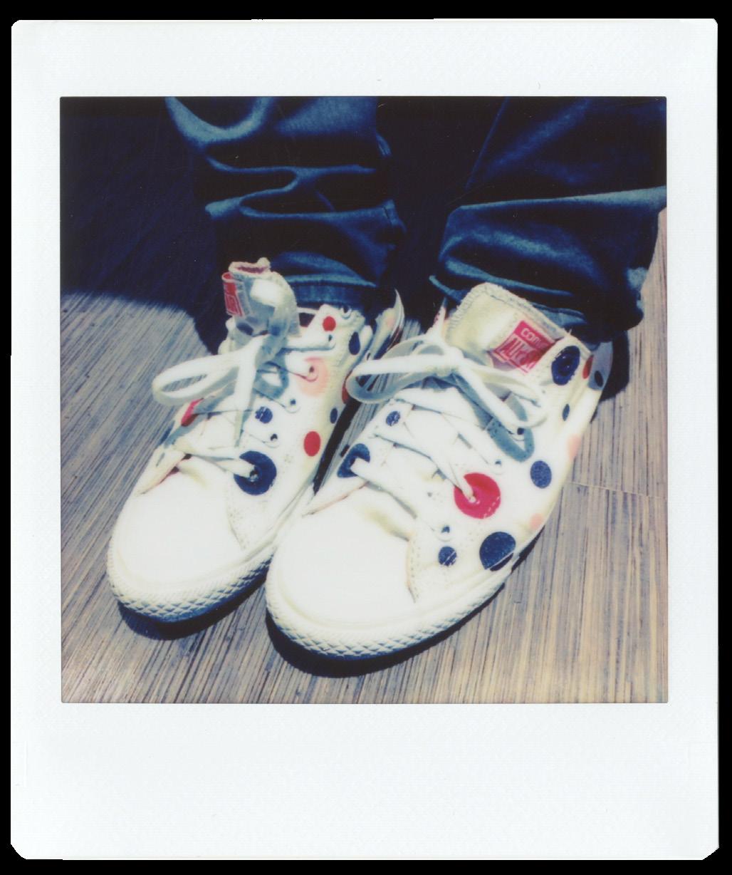 The Converse sneakers (below, center) were Steven Davis’s father’s. “I found them in his closet.” The other colorful pair were bought at a fair in Brooklyn, “Only three pairs exist. They were hand-made in Thailand.”