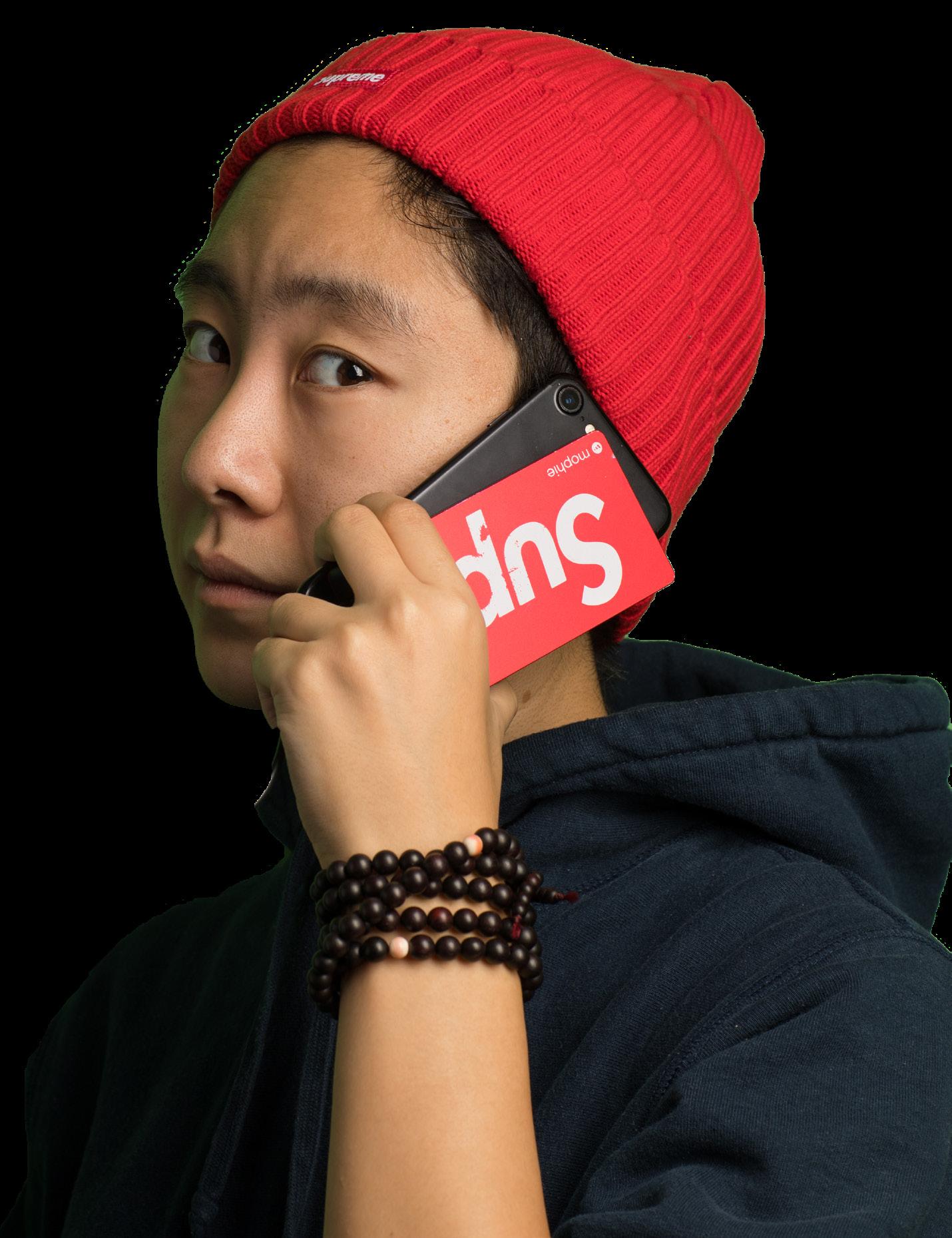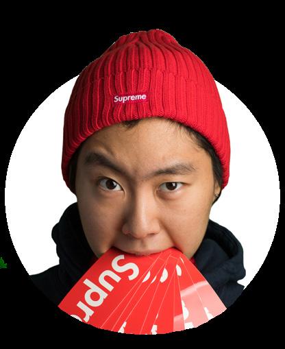 The stickers are free with purchase or available for sale outright. Left, Amina holds a Supreme charger. Amina Cheng BFA Design Third-year student