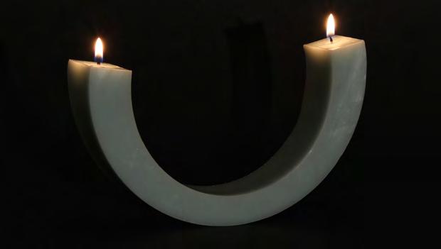 ✒Wax is an important medium for artist Habby Osk (MFA 2009 Fine Arts); its physical qualities lend themselves well to her work’s themes of balance and imbalance and permanency and impermanency. So when she decided to branch out into a more commercial pursuit—something “closely related to my practice, but at the same time blurring the line between art and design,” she says—sticking with the material was a logical choice. Her business, Sculpture & Flame, offers handcrafted candles that can be lit at either end. The pieces, called Burning Both Ends, are all individually crafted and