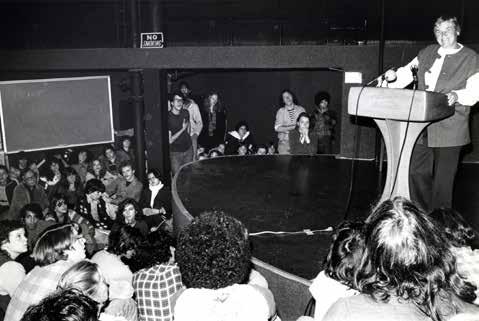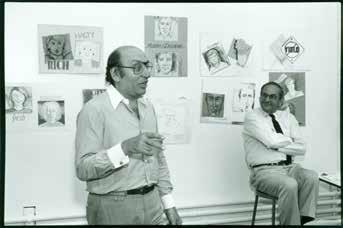 CLOCKWISE FROM TOP Salvador Dalí lecturing at SVA in 1963; the poster for Dalí’s talk; painter Agnes Martin addresses SVA students in 1979; filmmaker Hal Ashby at a 1976 Filmmakers Dialogue event, hosted by Ralph Applebaum. Images courtesy SVA Archives.