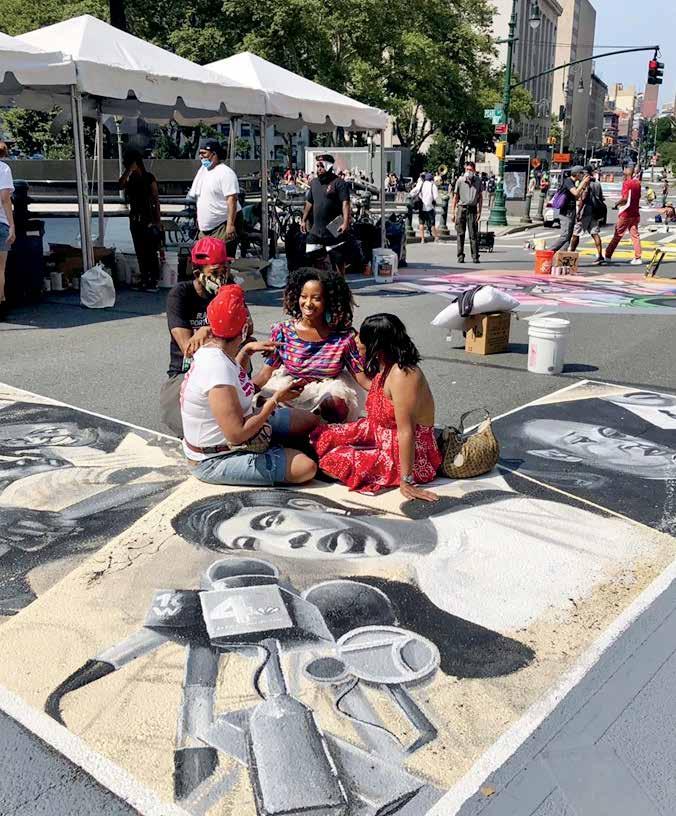 ABOVE, LEFT AND BOTTOM RIGHT Artist and SVA alumnus and faculty member Sophia Dawson (center) at the Black Lives Matter mural in Manhattan’s Foley Square. Dawson designed the letters for the word “Lives.” Images courtesy Sophia Dawson.