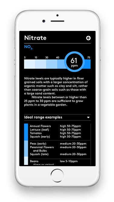 ABOVE Sample screens for the Soiled app, which would use a color spectrum to display soil nutrient levels.
