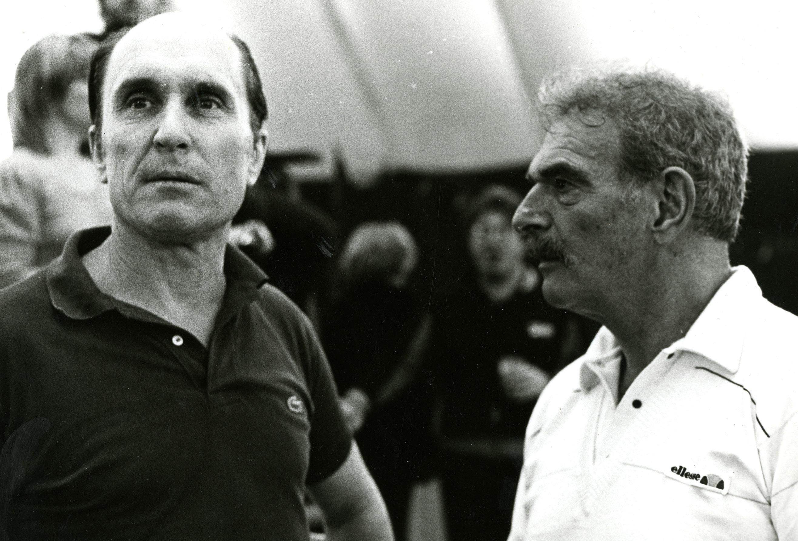 ABOVE From left, artist Don Nice, an unidentified woman, Visual Arts Gallery coordinator Jeanie Blake, art dealer Louis Meisel and artist Roy Lichtenstein at the 1979 SVA Scholarship Fund Annual Tennis Tournament. BELOW Actor Robert Duvall and SVA founder Silas H. Rhodes at the 1979 SVA Scholarship Fund Annual Tennis Tournament.