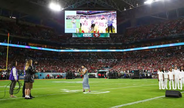 Artist and SVA alumnus Christine Sun Kim performed the national anthem and “America the Beautiful” in American Sign Language at Super Bowl LIV in Miami. Photos: Ben Liebenberg/NFL.