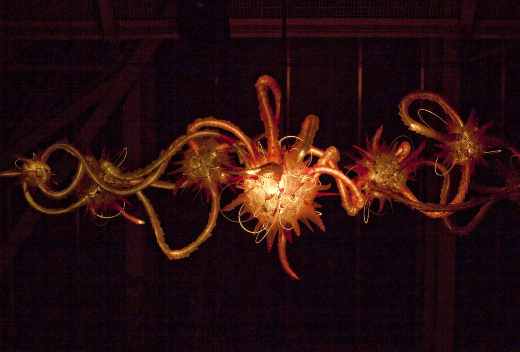entirely of water bottles glowing different colors and stretching 16 feet in length, and an interactive walk-through portal made of thousands of CDs, by Texas-based artist Leticia Bajuyo. Other artists exhibiting work include Tom Deininger and Portia Munson.