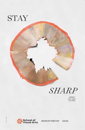 Vecchio’s poster features a large, photorealistic painting of a circular pencil shaving. Its interior void hints at the outline of the SVA logo, originated in 1997 by the late designer George Tscherny, who taught SVA’s first design course in its early years (see page 7). The