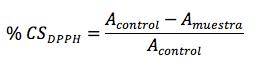 • Método de la capacidad secuestrante de radicales libres con 2,2-difenil-1-picril-hidrazil (DPPH): se tomaron volúmenes equivalentes para el rango de concentración de 2,00 a 200 μ g mL1 y se mezclaron con 2,8 mL de la solución de DPPH 6 x 10-2 mm preparada en metanol, se dejaron en reposo durante 30 minutos protegi das de la luz. Transcurrido el tiempo, se midieron las absorbancias a la longitud de 517 nm, de igual manera, se preparó una curva de calibración de ácido ascórbico a las concentra ciones entre 0,4 a 2 μg mL-1. La capacidad secuestrante (CS) para el radical DPPH fue calculado utilizando la siguiente ecuación: En donde: Acontrol= absorbancia de la reacción control (DPPH + metanol) y Amuestra= absorbancia de la reacción con la muestra (DPPH +muestra). Los valores de IC50 se expresaron como la concentración en μg ml-1 de la muestra necesaria para disminuir en un 50% la concentración inicial del DPPH [19].