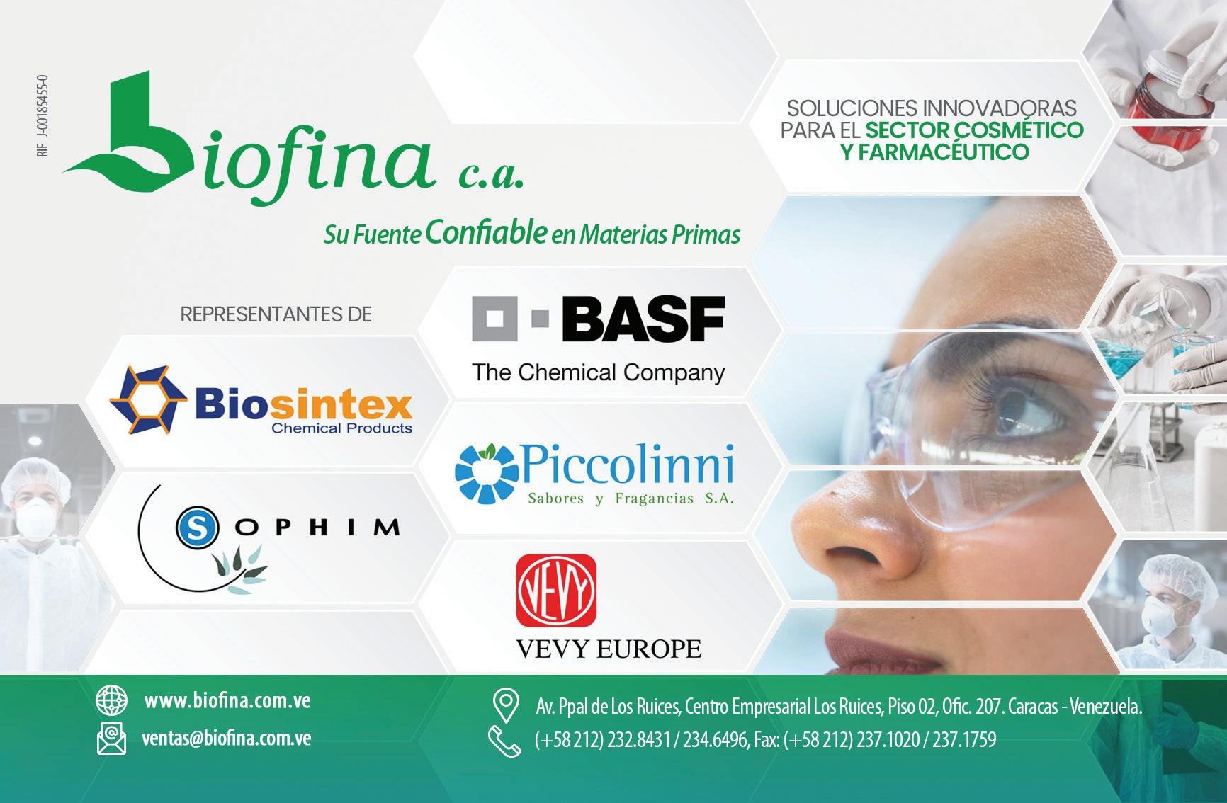 Av. Don Diego Cisneros. Edif. Centro Empresarial Los Ruices, Piso 2, O cina 207. Caracas. Teléfonos: +58 212 2349630 / 2328431 www.bio na.com.ve Bio na es una compañía de capital venezolano, representante de importantes compañías fabricantes de activos y excipientes para la elaboración de productos cosméticos, farmacéuticos y a nes. Contamos con el respaldo de Basf SE, Dullberg Konzentra, Vevy Europe, Sophim, BK Giulini, Biosintex. Con un personal altamente cali cado, ofrecemos asesoría técnica para formula ciones cosméticas. Poseemos la certi cación Fondonorma ISO 9001: 2008. MATERIA PRIMA.