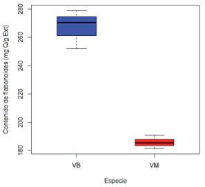 Con relación a la cantidad de Flavonoides Totales, los valores obtenidos de la ecuación de la recta (Y=0,0143X-0,0026; r= 0,9981) derivados de la curva de calibración con el patrón de Quercetina (Q) permitieron establecer como se muestra en la Figura 3, una mayor concentración en la especie VB (267,07 mg Eq Q/g Ext) en comparación con VM (195,94 mg Eq Q/g Ext), los mismos fueron contrastados con la aplicación de la t de Student (95%; α=0,05).