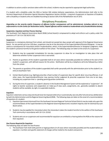 d. Students with Disabilities: If a student with a disability under the IDEA or Section 504 violates this policy, the Administration shall refer to Vermont Department of Education Special Education Regulations Section 4312 – Long-term Suspension or Expulsion of Students with a Disability or Students who are Disabled According to Section 504 of the Rehabilitation Act.