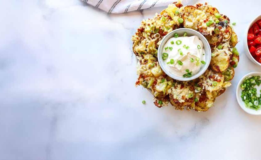 the oven temperature to 450 F and bake the layered potatoes for 4-5 minutes or until cheese is fully melted. Serve immediately with sour cream or a favorite dip. This recipe serves about six, so double the amounts if desired. ■