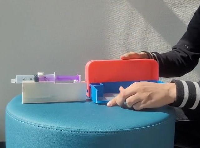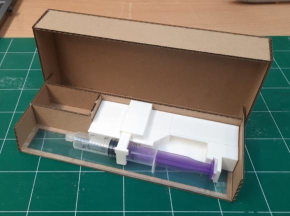 De lock-box is een beschermend afsluitend omhulsel waar een syringe pump in past die aan een band langs het lichaam word gedragen.
