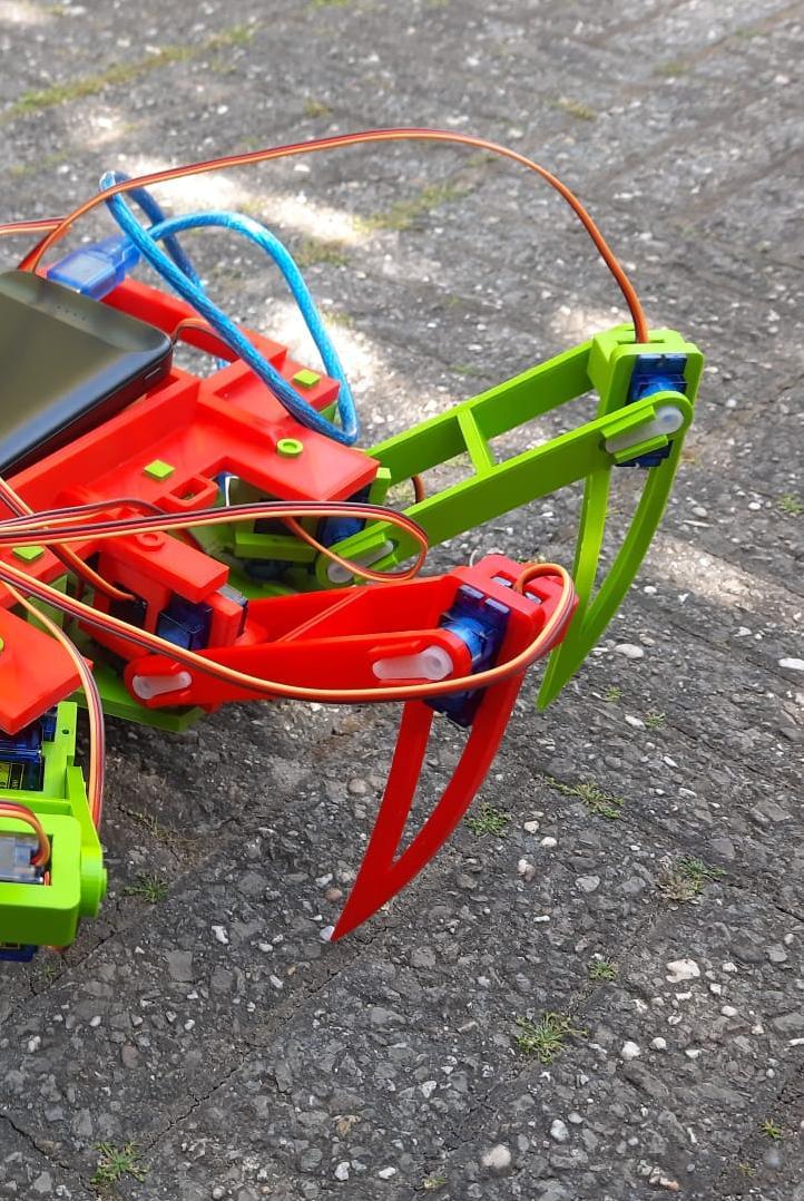 Spin aangedreven door arduino Als eigen project heb ik een robotische spin ontworpen en gebouwd. Het kniegewricht was hierin het grootse obstakel, deze zit aan het midden lijf en zorgt voor zowel horizontaal als verticale beweging van de benen. Daarnaast huizen ze ook de twee arduino’s die deze bewegingen aandrijven, waardoor het een lastig knelpunt in het ontwerp was. Ik heb verschillende prototypes gemaakt, getest en verbeterd om tot een eindontwerp te komen.