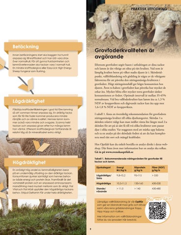 I tabell 1. finns en översiktlig rekommendation för grovfodrets näringsmässiga kvalitet till olika djurkategorier. Skördas 1:a skörden relativt tidigt kan man istället vänta lite längre med 2:a skörden för att på så sätt få till två olika kvaliteter som passar djur i olika stadier. Var noggrann med att märka upp balarna och ta en analys på det skördade fodret så att du kan komplettera med rätt sort och mängd kraftfoder. Hos Optilab kan du enkelt beställa en analys direkt i deras webshop. Där finns även mer information hur en analys ska tolkas. Gå in på www.svenskaoptilab.se Tabell 1. Rekommenderade näringsvärden för grovfoder till tackor och lamm.