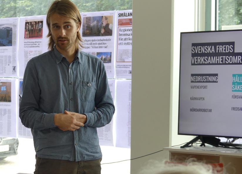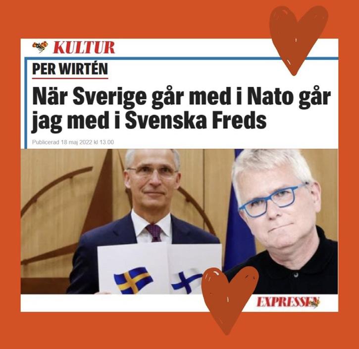 SVENSKA FREDS HAR OFTA uppfattats som en till synes ensam kritisk röst i den snäva säkerhetspo litiska debatten. Vi tvekar aldrig att stå upp för Svenska Freds perspektiv på fred och säkerhet och önskar att fler röster för ickevåld, antimilitarism och fredlig konflikthantering fick utrymme att synas och höras. Under våren besökte journalister från hela världen vårt kontor när både vi här i Sverige och omvärlden överrumplades av med vilken hastighet Sverige gjorde en helomvändning av säkerhetspolitiken och ansökte om Natomedlemskap. Utan fördjupad debatt eller konsultation av medborgarna. Men vi var långt ifrån ensamma och vår gemensamma röst har blivit starkare av de tusentals nya medlemmar som sökte sig till Svenska Freds. Många av er har de senaste veckorna kanaliserat frustrationen genom att påverka och skicka in egna remissvar mot Nato till Utrikesdepartementet. Det kan du läsa mer om på sidan 5.