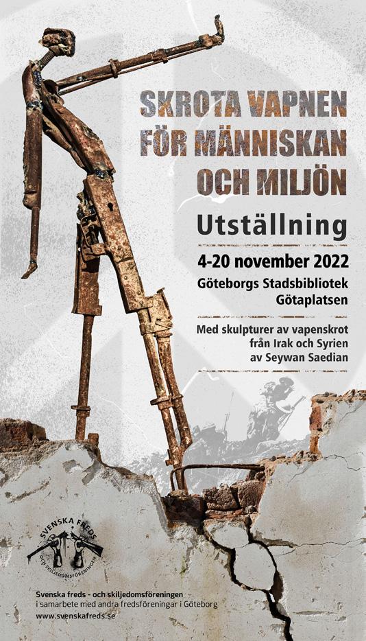 ”Skrota vapnen – för människan och miljön” heter utställningen som Svenska Freds lokalförening i Göteborg arrangerade på stadens Stadsbibliotek under november. Och just skrotade vapen – omvandlade till konst – står i centrum. Tretton skulpturer av konstnären Seywan Saedian, född och uppvuxen i de kurdiska delarna av Iran, ställs ut.