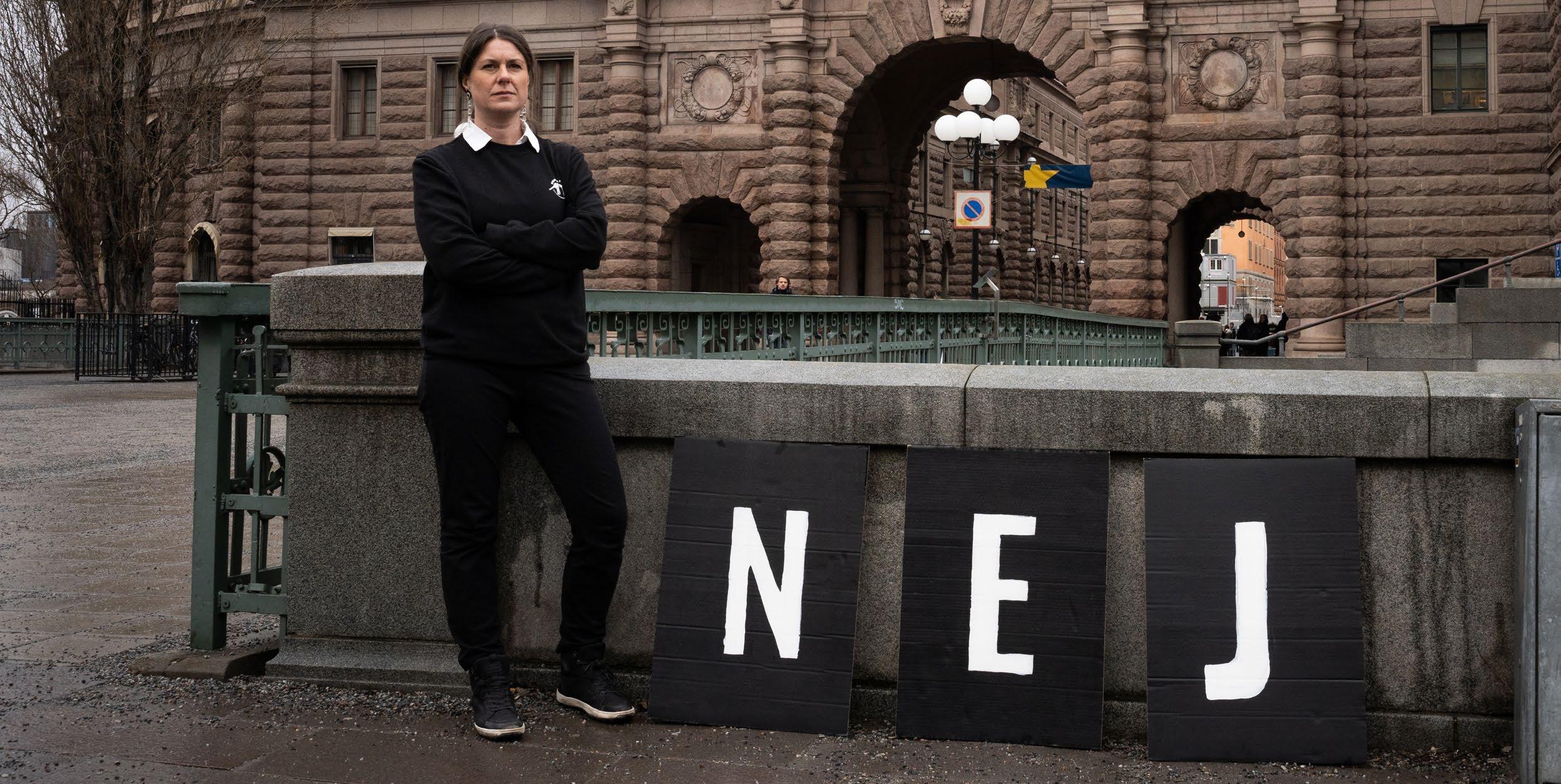NEJ till Nato! Bild från aktion utanför riksdagen i februari 2023. Foto: Axel Dagman.